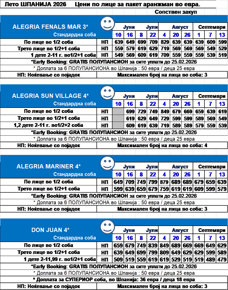 • Доплата за еднокреветна соба (Hotel Don Juan): плус 50% од цената дадена во ценовникот.